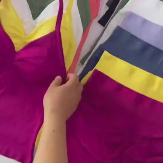 Each set includes a matching crop top and shorts made from breathable, curve hugging nylon and spandex for the perfect fit.